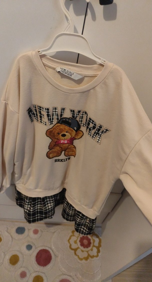 Bol kesim kahverengi uzun kollu sweatshirt, baskılı ayı ve yazı detaylıdır. Fırfır ve yumuşak, sıcak kumaşa sahiptir.
