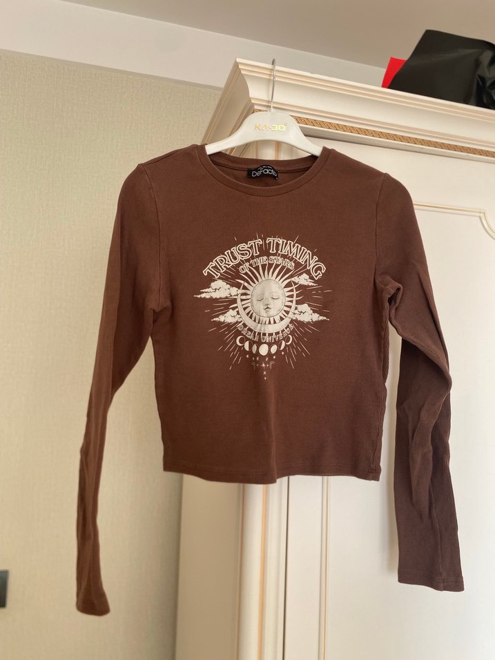 Kahverengi baskılı, uzun kollu ve yuvarlak yakalı kız tişörtü. Süet dokusu ve düğme detayıyla bohem, retro tarzı yansıtıyor.