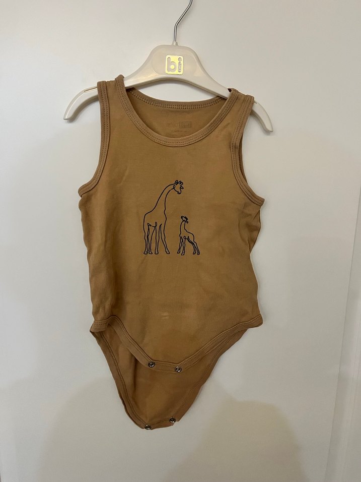 Kahverengi, kolsuz bebek body, bisiklet yaka ve zürafa baskılı. Yumuşak ve sıcak kumaştan, rahat sokak stili için uygun.