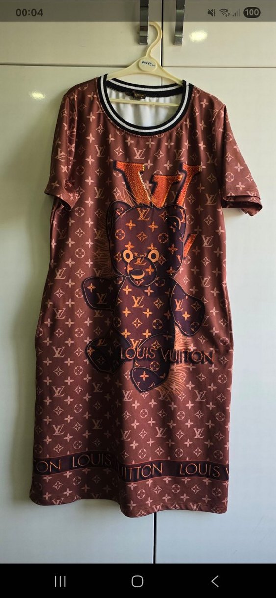 Kahverengi baskılı midi kadın elbise, kısa kollu ve yuvarlak yaka. Sentetik kumaştan, bol kesim ve drapeli tarzda, günlük kullanım için uygundur.