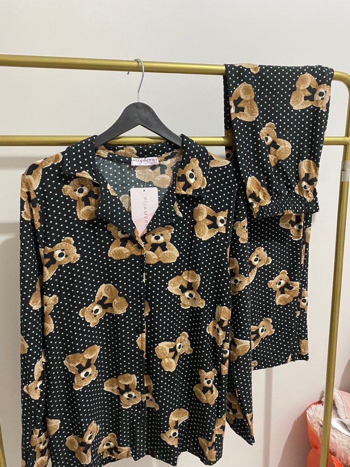 Bol kesim, uzun kollu, kısa boy kadın pijama takımı. Siyah zemin üzerine kahverengi ayıcık baskılı, rahat sokak stili için uygundur.