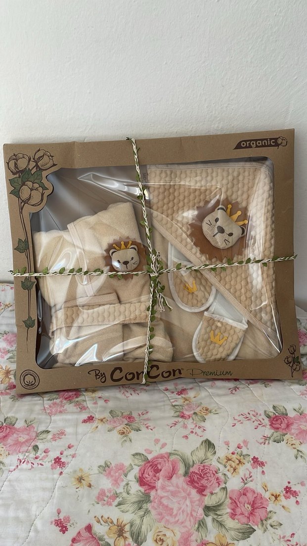 Kahverengi örgü kumaştan yapılmış, baskılı aslan desenli bebek havlu seti. Kare havlu bornoz kese ve terlik içerir. CorganicCo markasına ait. Bende vardı hediye geldi hiç açmadım bile.