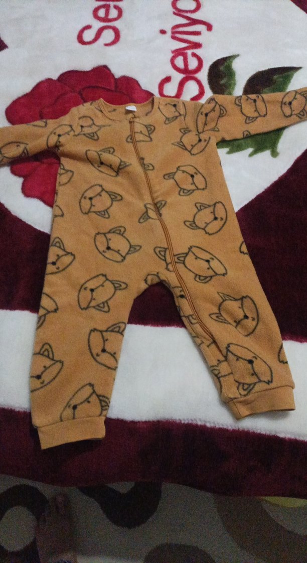 Kahverengi, uzun kollu ve bisiklet yaka bebek tulumu. hiç girilmedi yıkanıp öyle dolapta durdu Yumuşak örme kumaştan, renkli baskılı desenlere sahip.