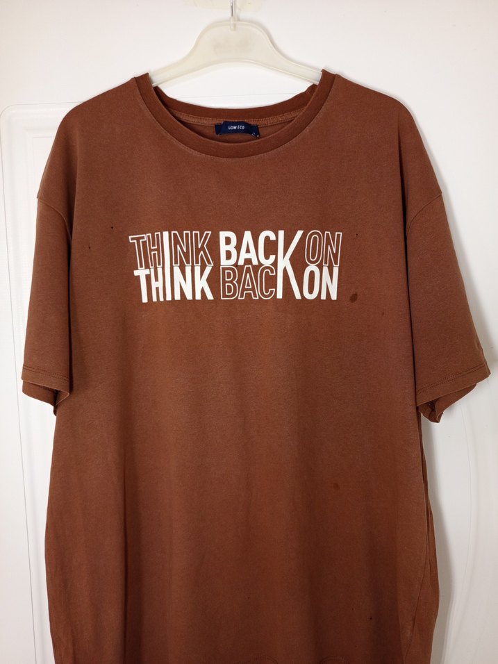 Kahverengi pamuk tişört, yuvarlak yaka ve kısa kolludur. Oversize kesimi ve baskılı deseniyle rahat sokak tarzı sunar.