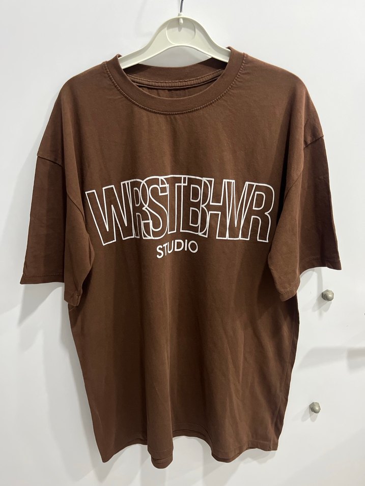 Kahverengi, kısa kollu, yuvarlak yakalı, baskılı 'WRSTBWR STUDIO' yazılı oversize tişört, sentetik kumaştan, rahat sokak stili.