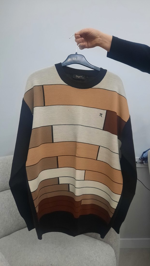 Bisiklet yaka, uzun kollu, bol kesim erkek triko kazak. Sentetik kumaştan örülmüş, koyu kahverengi baskılı desene sahip, günlük rahat kullanım için uygundur.