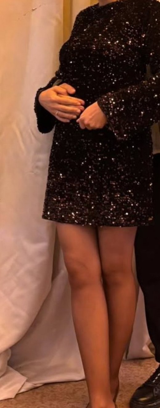 Koyu kahverengi baskılı, vücuda oturan ve normal boyda tasarlanmış payetli elbise. 1 kez kullanıldı