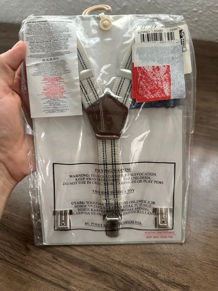 Kahverengi baskılı plastik çocuk askısı, tokalı ve nostaljik bir tarzda. Üzerinde uyarı etiketi bulunur. ⚠️