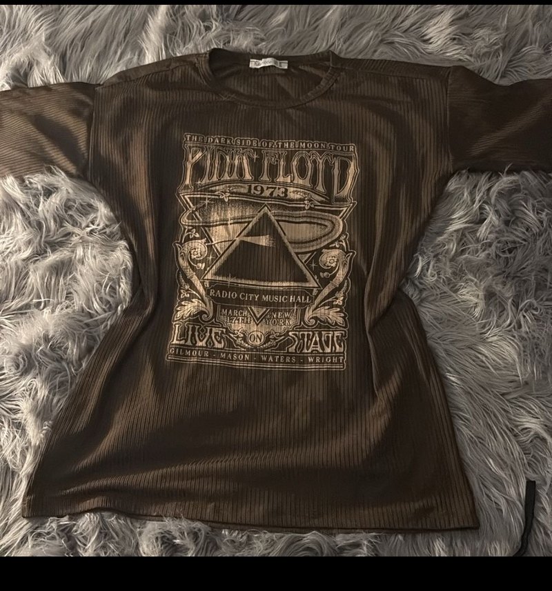 Kahverengi, baskılı rock punk desenli, kısa kollu, bisiklet yaka, vücuda oturan kadın tişörtü, M\L beden uygundur günlük kullanım için uygundur.