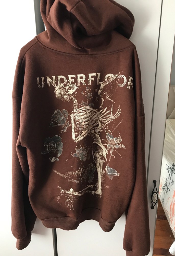 M/L beden giyenler icin uygundur. Kahverengi süet kumaştan, uzun kollu ve yuvarlak yakalı sweatshirt. "UNDERFLOOR " yazılı iskelet ve çiçek baskısı bulunur. Salaş kesim, midi boy ve günlük kullanım için uygundur.