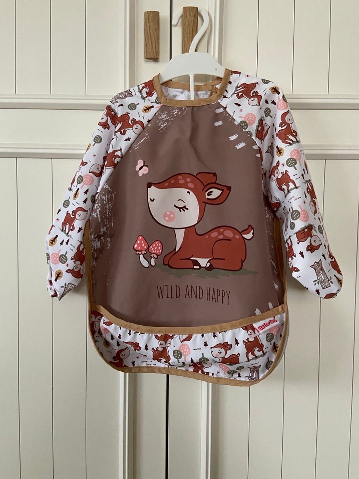 Uzun kollu, kahverengi zemin üzerinde geyik ve mantar baskılı bebek önlüğü. "WILD AND HAPPY" yazılı, cepli ve kolları desenli beyaz renktedir. Sıfır önlük temiz lekesiz ve defosuzdur 6 aydan itibaren her yaşta kullanılır hiç kullanılmadı