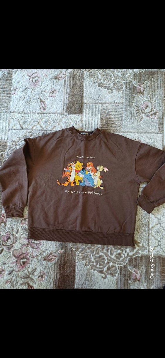 Uzun kollu, bisiklet yaka, bol kesim kahverengi sweatshirt. Yumuşak kürk dokulu kumaştan, örme detaylı, baskılı tasarım. Günlük rahat sokak stili için uygun.