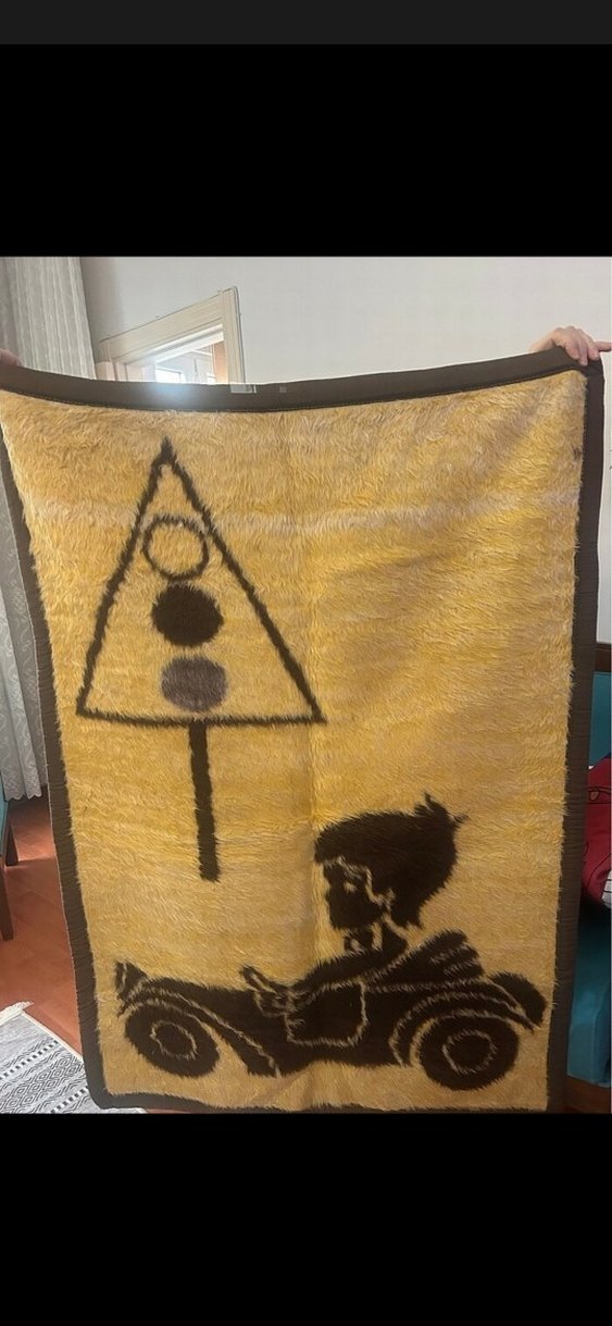 Kahverengi baskılı yün çocuk battaniyesi, arabada çocuk ve trafik ışığı desenli, yumuşak ve sıcak tutar.