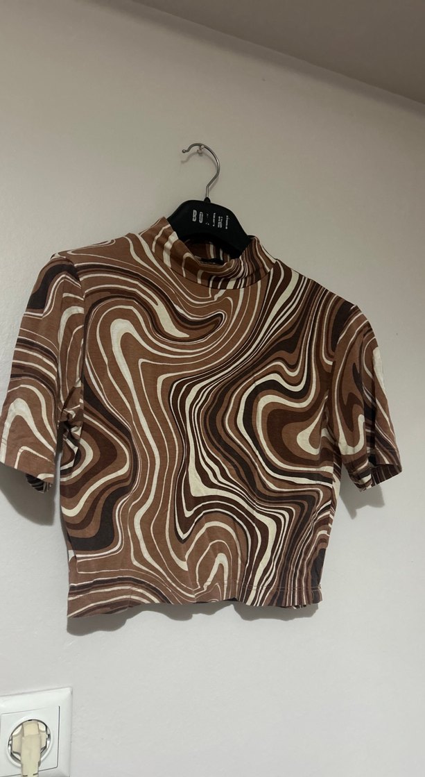 Kahverengi batik desenli, kısa kollu, boğazlı ve pileli detaylı, yumuşak sentetik kumaştan yapılmış dar kesim bluz. Modern tarz için uygundur.