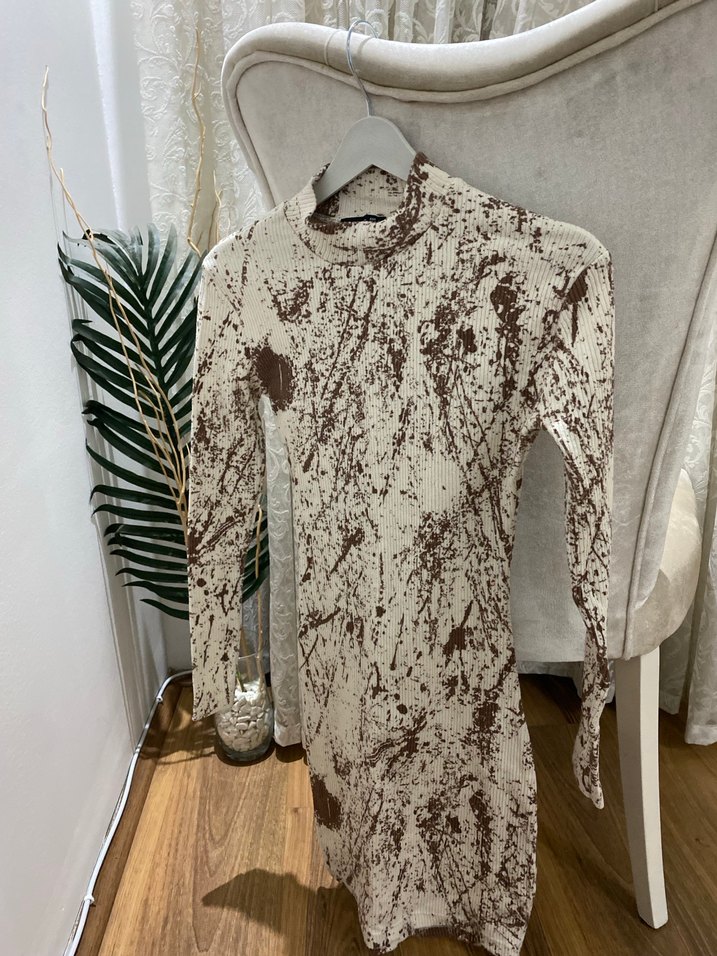 Kahverengi batik desenli, boğazlı ve uzun kollu kadın kazak. Yumuşak sentetik kumaştan örülmüş, sokak stiline uygun kısa ve vücuda oturan kesim.
