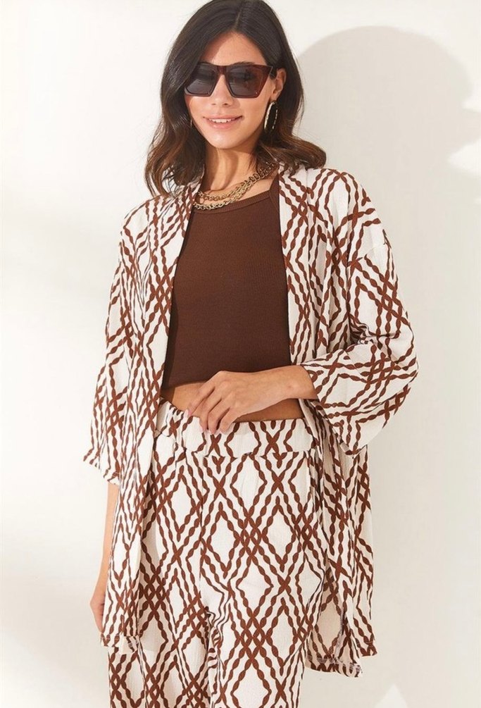 Kahverengi Batik Desenli Bohem Kadın Kimono