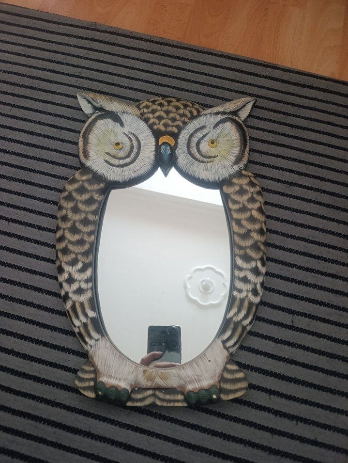 Kahverengi ve gri detaylara sahip baykuş figürlü çerçevesiyle dekoratif ve kullanışlı bir ayna.