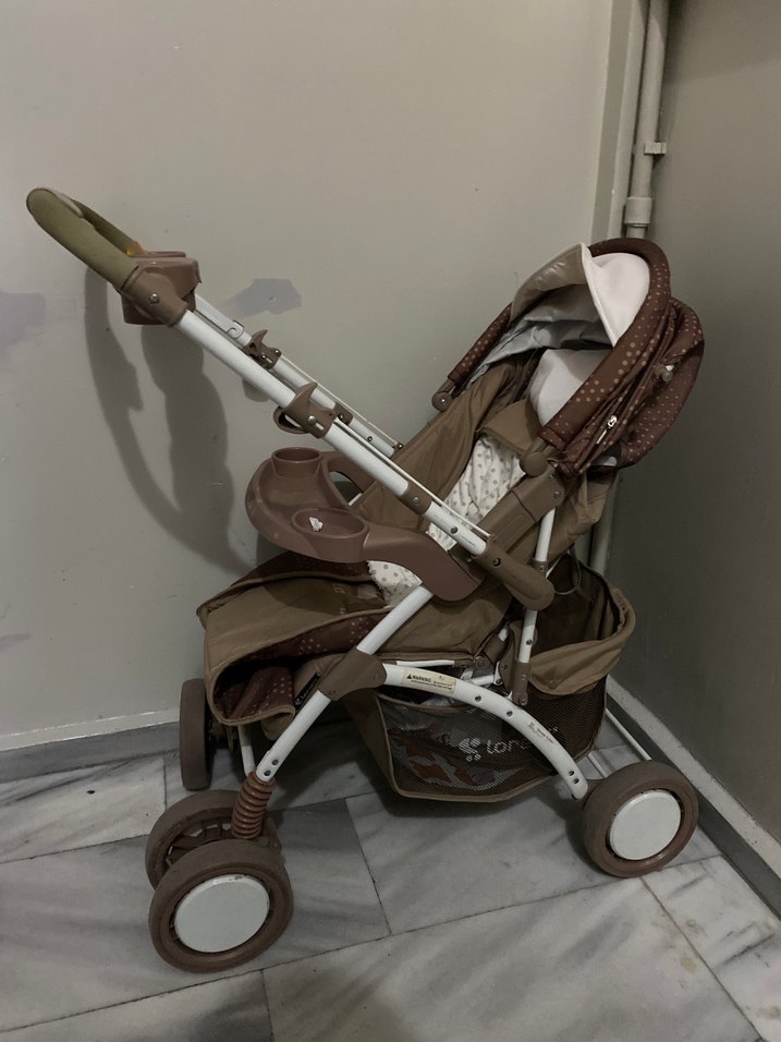 Sağlam gövdeye ve rahat oturma alanına sahip kahverengi bebek arabası. Altında saklama sepeti ve ayarlanabilir tutma kolu bulunur.