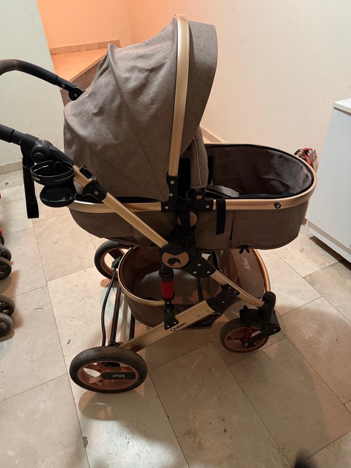 Kahverengi ve gri renkli, tente ve saklama sepeti bulunan, sağlam tekerlekli ve konforlu tutma saplı bebek arabası.