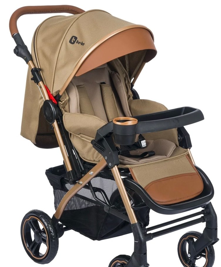 Ayarlanabilir tente, yastıklı oturma alanı, emniyet kemeri ve saklama sepeti bulunan açık kahverengi bebek arabası. Bardak tutucusu mevcuttur.