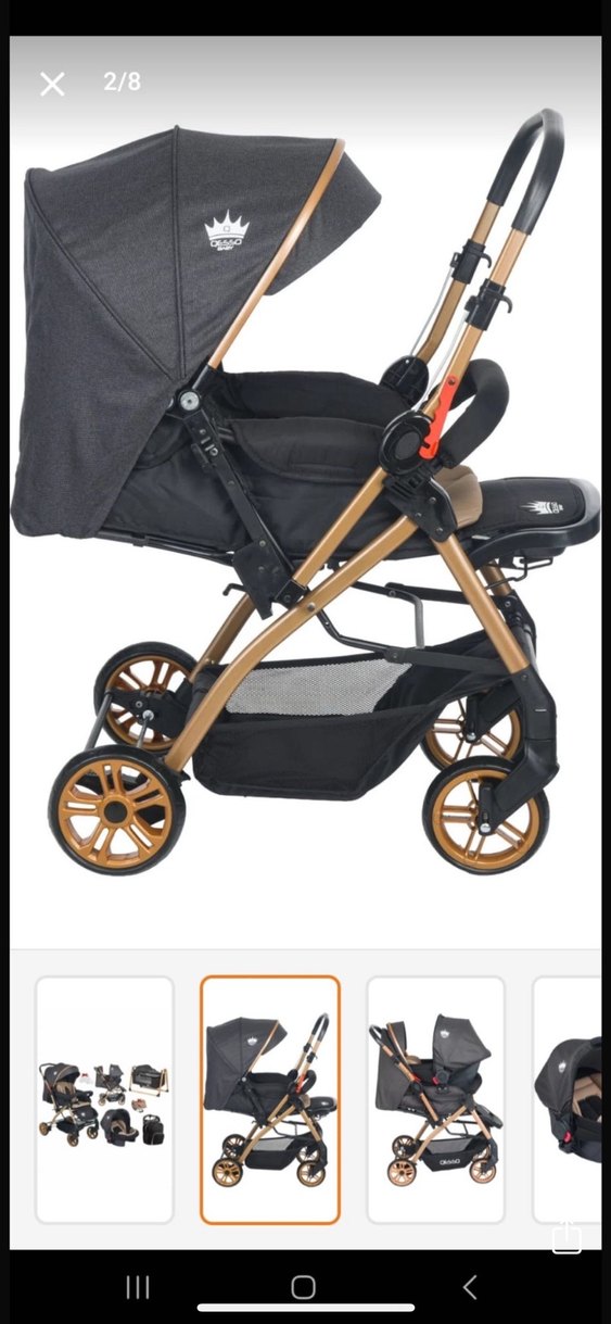 Bu bebek arabası koyu renk kumaş oturma alanı ve kahverengi iskelet yapısıyla sağlam ve konforlu bir sürüş sunar.