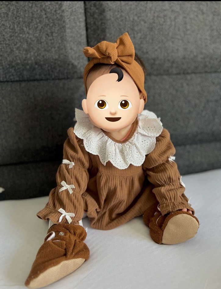 Kahverengi dokulu kumaştan yapılmış bebek kıyafeti, beyaz dantel yakalı.