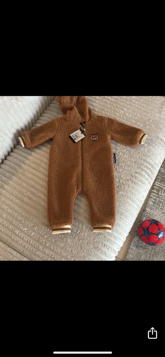 Koyu kahverengi, kapüşonlu ve ön fermuarlı peluş bebek tulumu. Sevimli ayı işlemeli, sokak stiline uygun tasarım. 6 9 ay,Beymen mağazasından alınmıştır,oğluma küçük geldi giydiremedim
