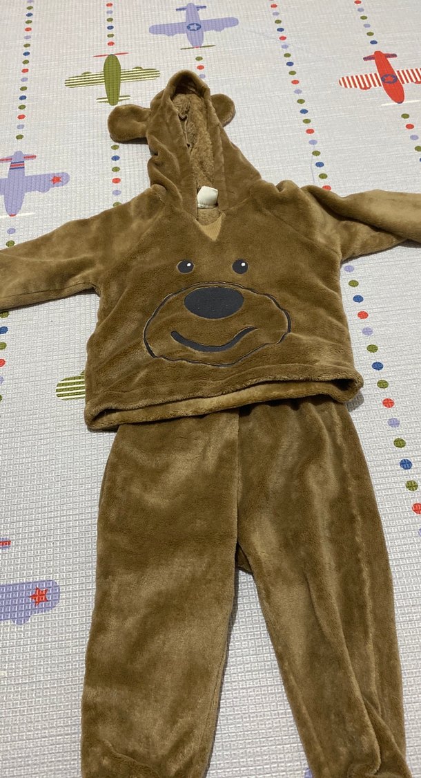 Koyu kahverengi, yumuşak ve sıcak kumaştan yapılmış, kürk detaylı ve önünde ayı yüzü desenli bebek erkek tulumu.