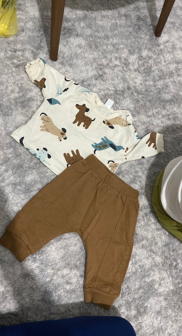 Kahverengi pantolon ve kürklü detaylı, baskılı uzun kollu tişörtten oluşan bebek erkek sokak stili takım.