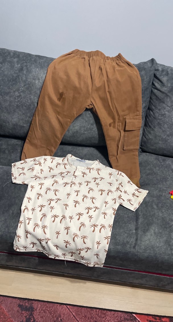 Kısa kollu, yuvarlak yaka, palmiye desenli üst ve cepli kahverengi pantolondan oluşan, rahat dokulu bebek erkek sokak stili takım. 9 yaş