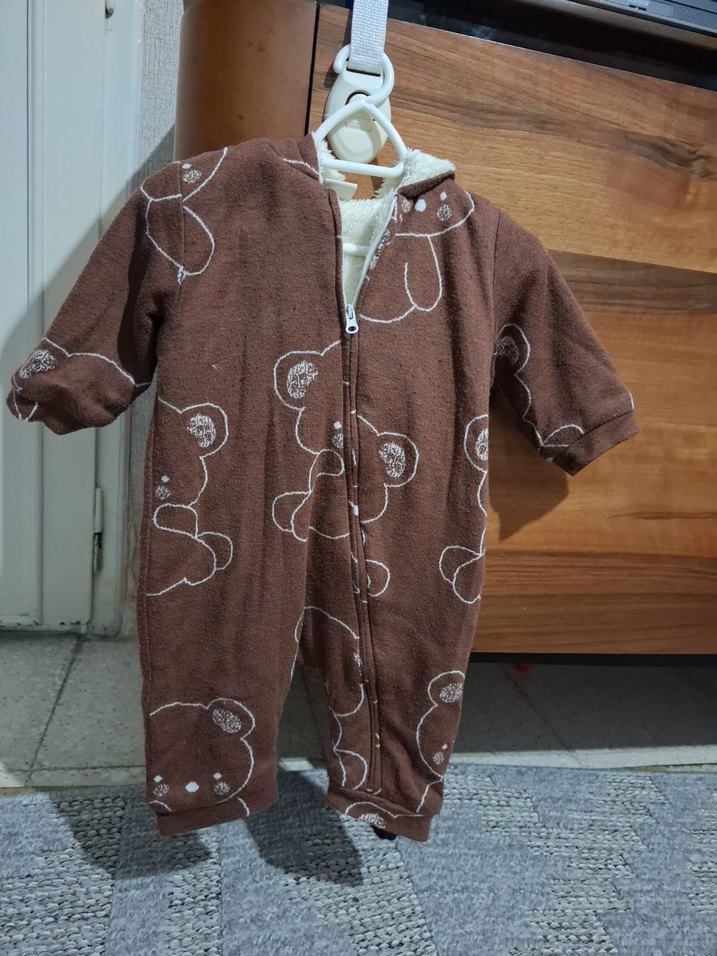 Kahverengi, düğmeli ve yumuşak kumaştan yapılmış bebek erkek tulumu. Sokak stili ve hafif ayıcık desenli. Fotoğrafta göründüğü gibidir