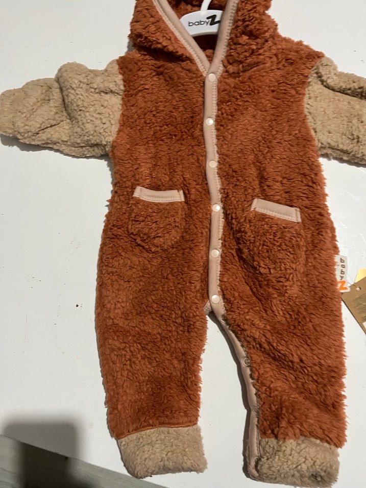 Kahverengi peluş kumaştan yapılmış, kapüşonlu ve çıtçıt düğmeli bebek tulumu. Soğuk havalar için sıcak tutar. ❄️