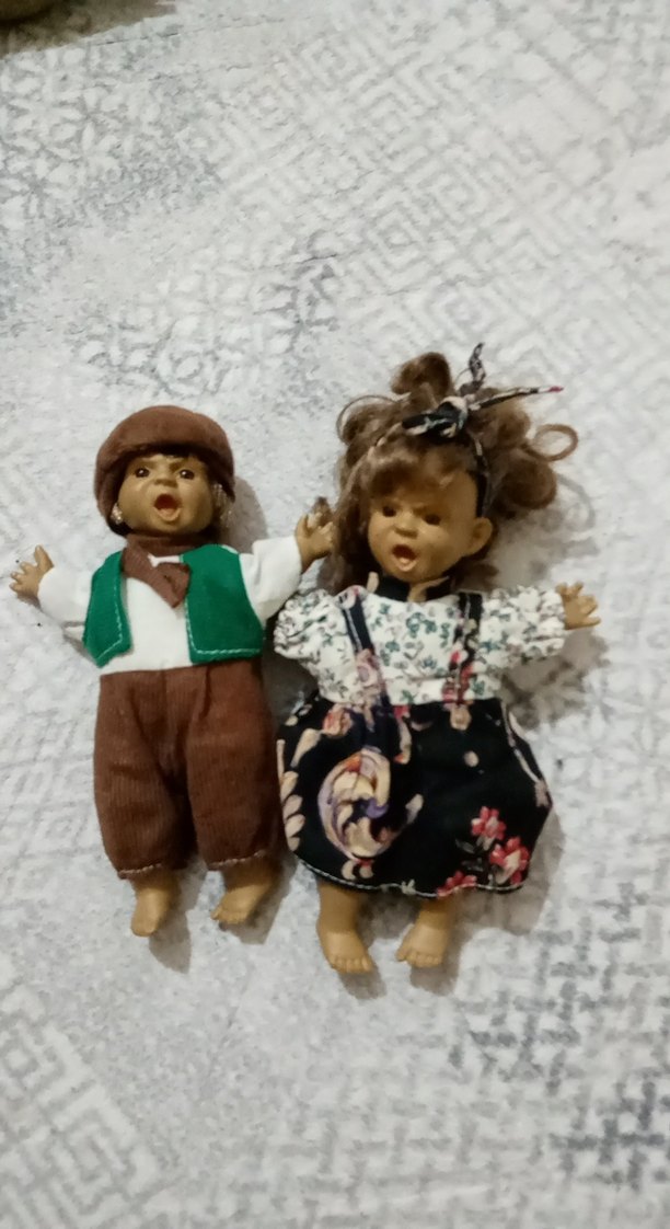 Yeşil yelek ve kahverengi pantolonlu, diğeriyse çiçekli elbise ve askılı giysili iki kahverengi bebek.