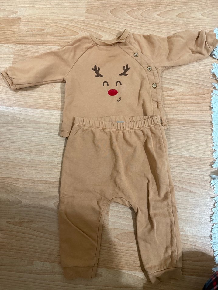 Pastel kahverengi, yumuşak ve sıcak kumaştan yapılmış uzun kollu, düğmeli ve geyik figürlü bebek takımı.