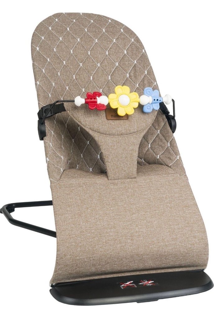 Yumuşak kumaşlı kahverengi bebek taşıma slingine eğlenceli oyuncaklar eklenmiştir.