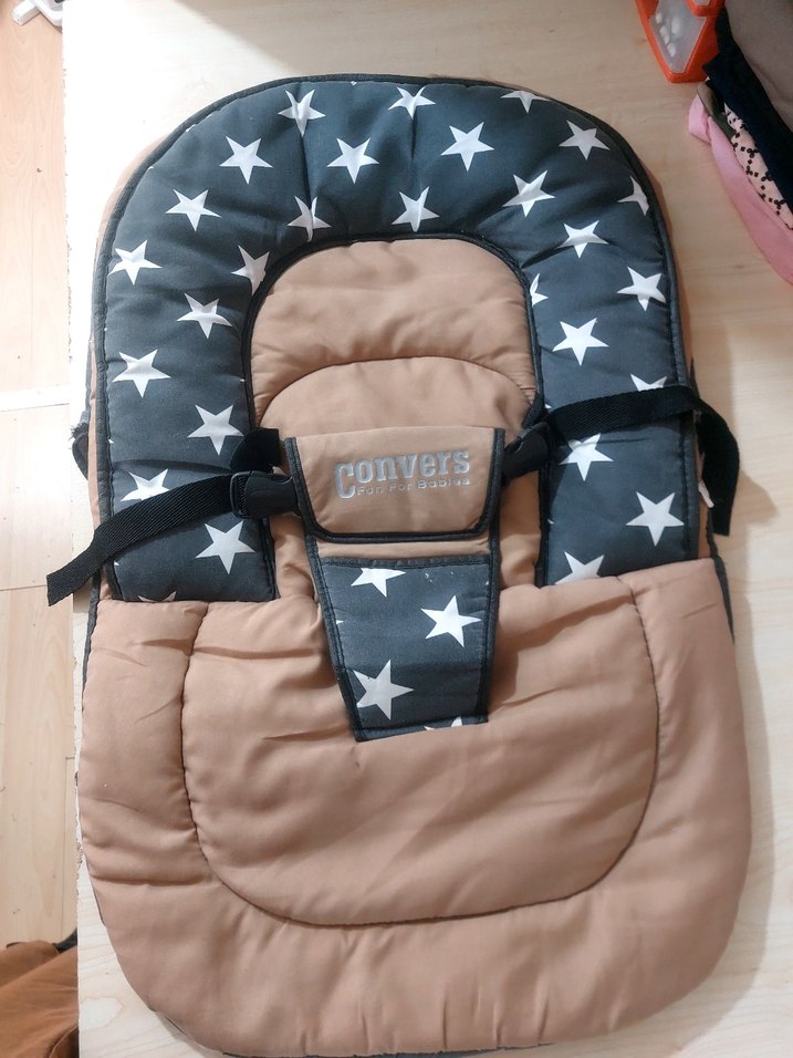 Kahverengi ve yıldız desenli, ayarlanabilir kayışlı bebek taşıma aparatı. Rahat yastıklı tasarım ile bebek desteği sağlar. ⭐ resimde görüldüğü gibidir