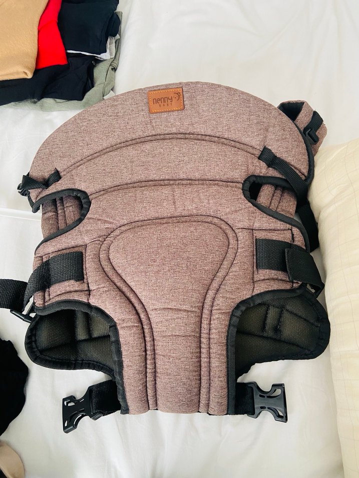 Ayarlanabilir kayışlara ve rahat taşıma için yastıklı desteğe sahip kahverengi bebek taşıyıcıdır. Bebeğinizi güvenle taşımak için uygundur.