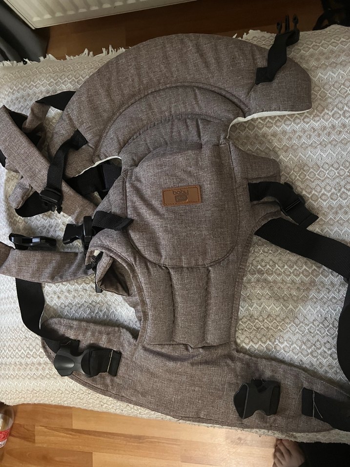 Kahverengi, ayarlanabilir askılı ve yumuşak kumaşlı bebek taşıyıcı kanguru. Rahat taşıma ve güvenli tutuş sağlar. Baby plus markadır