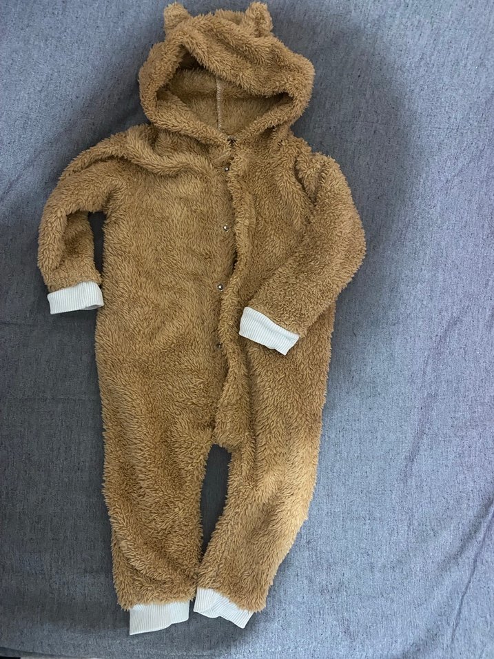 Kahverengi yumuşak ve sıcak kumaştan, kürklü detaylı kapüşonlu bebek tulumu. Beyaz manşetler ve çıtcıt kapamalıdır. ❄️ boyu 52 cm dir