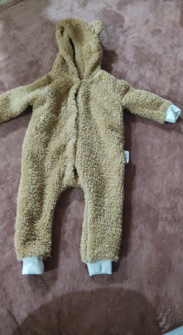 Kahverengi bebek tulumu, yumuşak ve sıcak kumaş, kürk detaylı ve kapüşonludur. Desensiz ve pastel tonlardadır.