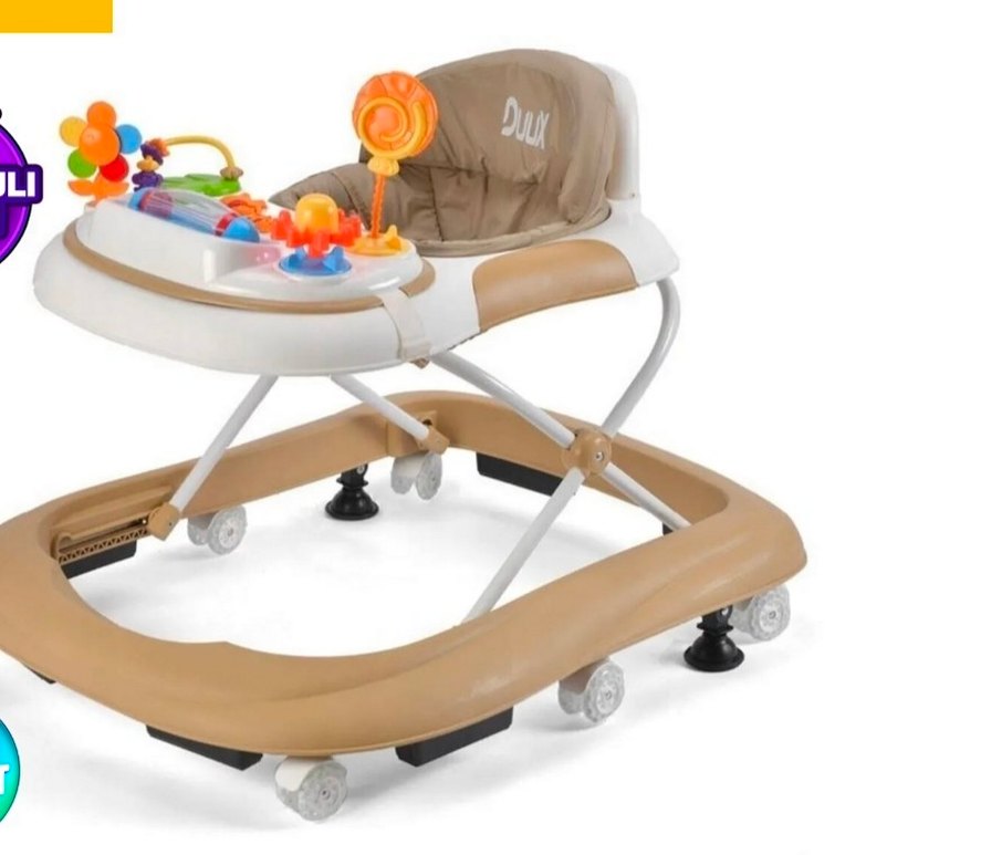 Kahverengi bebek yürüteci, rahat oturma alanı ve ön tepside oyun oyuncakları ile donatılmıştır. Dayanıklı çerçeve ve kolay hareket için tekerlekleri vardır.