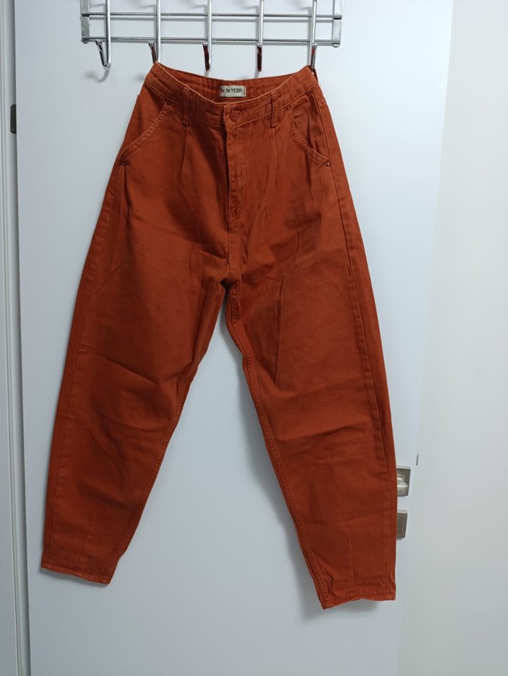 Kahverengi pamuk pantolon, bol kesim ve bel bantlı. Midi boy ve desensiz, günlük rahat kullanım için uygundur.