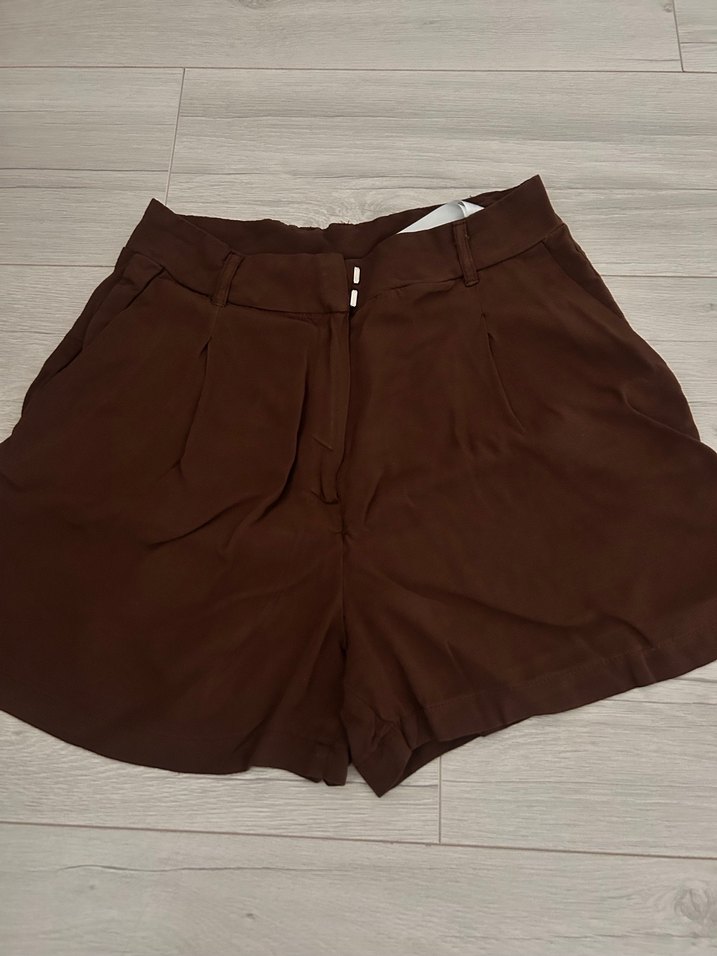 Kahverengi, beli kemerli yüksek bel mini şort. Bol kesim ve ipeksi dokusuyla günlük kullanıma uygun sade tasarım.