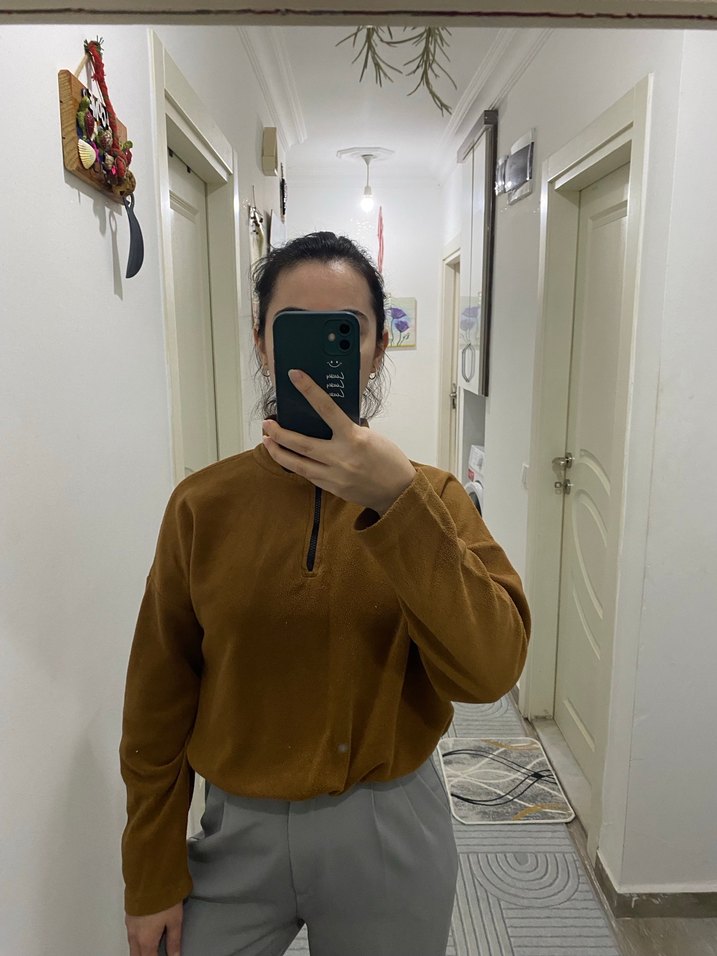 Kahverengi, yüksek yakalı, uzun kollu, rahat kesim kadın sweatshirtü, yumuşak ve sıcak kumaştan üretilmiştir.
