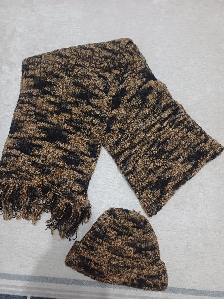 Kahverengi tonlarında, örgü dokulu, püsküllü atkı ve bere seti. az kullanılmıştır.