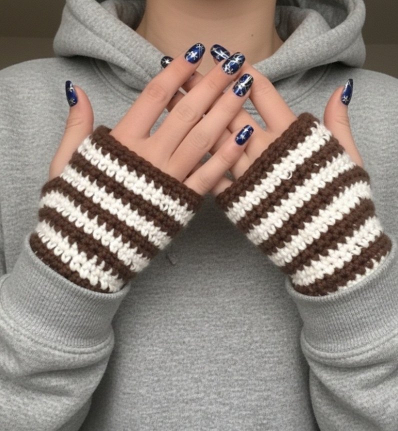 GÖRSEL BANA AİTTİR ILAN AÇIYORUM Kahverengi ve beyaz çizgili, yumuşak örgüden yapılmış parmakları açık eldivenler. Rahat ve gündelik kullanıma uygun.