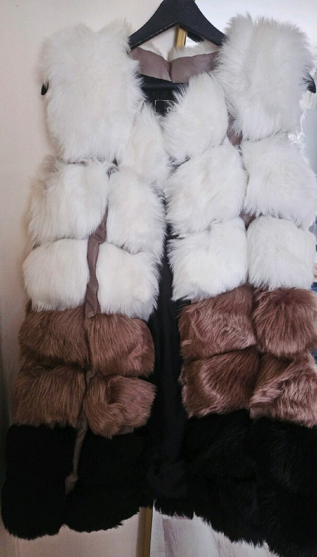 Kahverengi ve beyaz kürk detaylı, uzun ve straplez tasarımlı kadın yeleği. Rahat, şık ve bohem tarzda günlük kullanım için uygundur. Muhteşem kürk yelek (hakiki değil) yumuşacık ital ürün. Hiç giyinmedim tertemiz. 40/42 bedene uygun 85 cm. Alacak olan çok memnun kalacak.