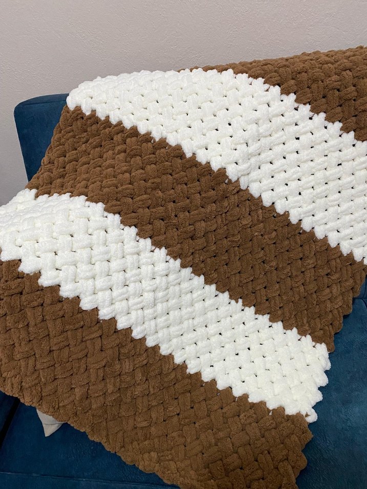Kahverengi ve beyaz çizgili örgü çocuk battaniyesi, yumuşak ve sıcak tutar. Desenli.