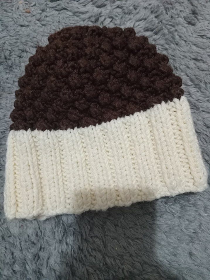 Kadın bere, kahverengi dokulu üst kısmı ve beyaz ribanalı katlanabilir kenarıyla örgü ve bohem tarzda, rahat bir görünüm sunar .