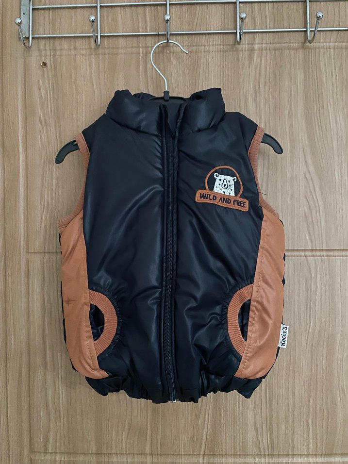 Kahverengi biker tarzı, kolsuz, bel kemerli erkek çocuk yeleği. Yuvarlak yaka ve baskılı detaylı, yumuşak ve sıcak kumaştan üretilmiştir. ️